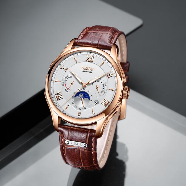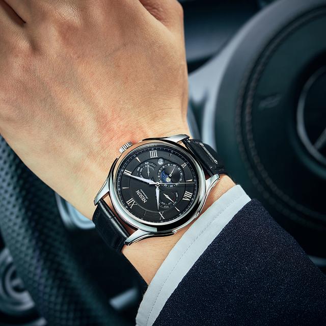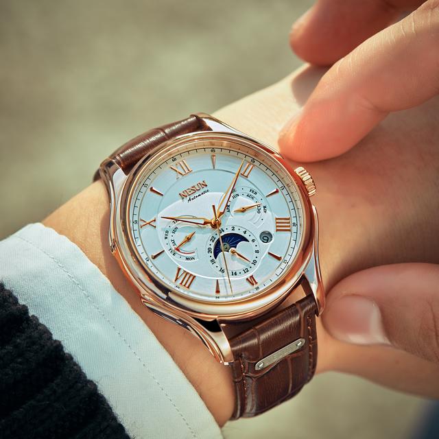 近几年玫金的配色出现在大众眼中的次数越来越多,像是玫金色的挂饰、手机等等,因此玫金元素也被视为现代流行色彩,紧跟潮流的NESUN尼尚在表款色泽的搭配上一直都相当成熟,在此次的新品9030系列中也运用了流行的玫金色表壳以及时尚的亮银色表壳,而表盘则分别采用了沉稳低调的黑白的配色,通过这几种配色也为新品9030系列定下了时尚而不失成熟的风格基调。
